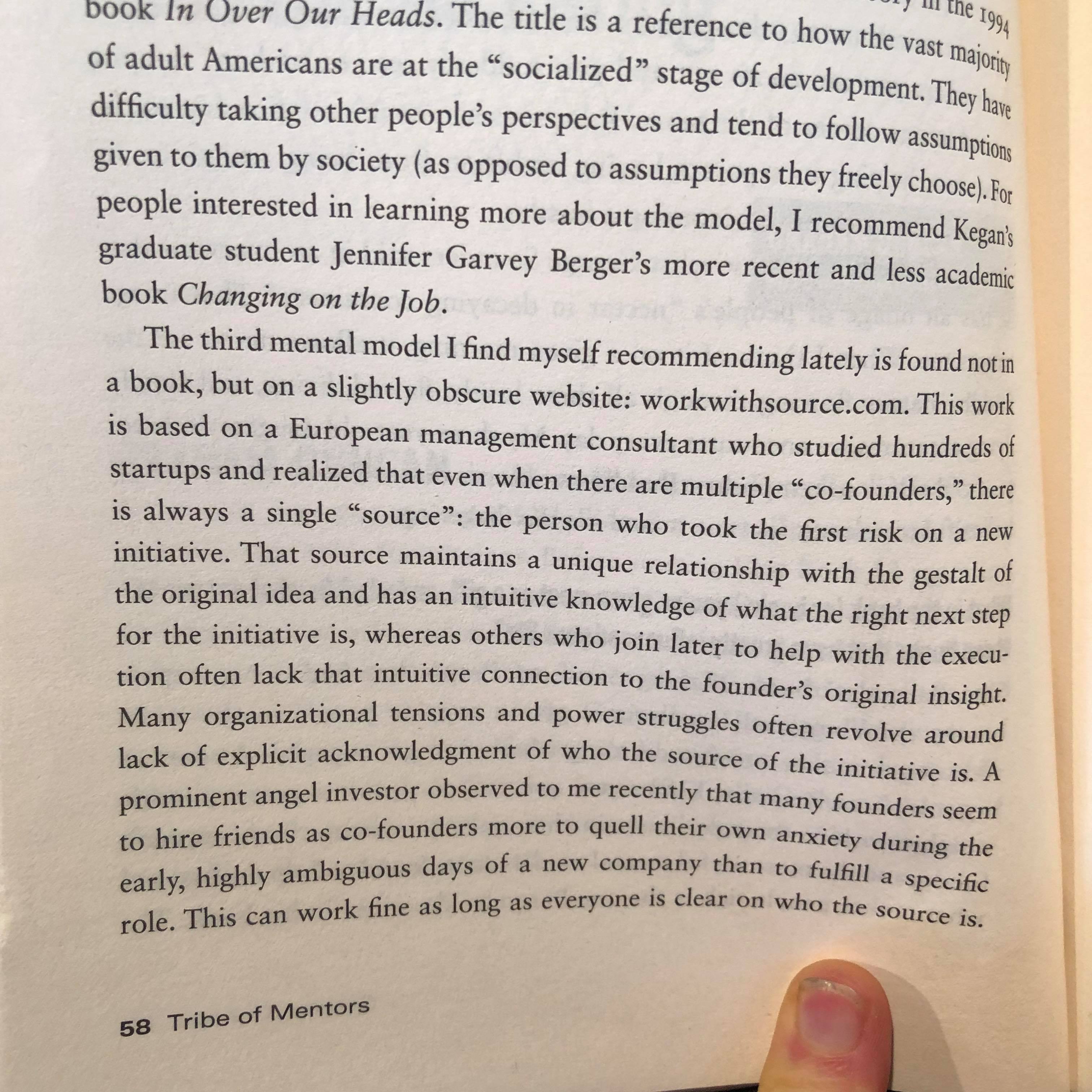 The excerpt begins with a nice introduction to the source principles. For anyone working with founders (like investors) it’s incredibly useful to break through the notion that co-founders started a business together, and instead acknowledge which of the group is the source – the one originating founder. That individual will have a different and special intuitive connection to the initiative which plays an enormous role in the vitality of the initiative as it grows. As Duncan recognises, this is also incredibly important during a succession process when a founder-CEO leaves a business they started and hands over the reigns.